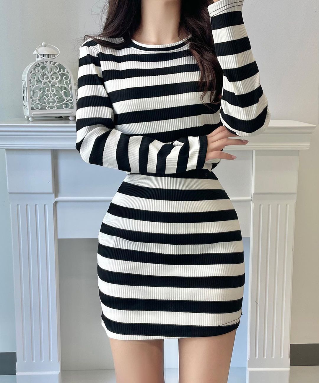 단가라 긴팔 티셔츠 + 미니스커트 세트에요🖤
