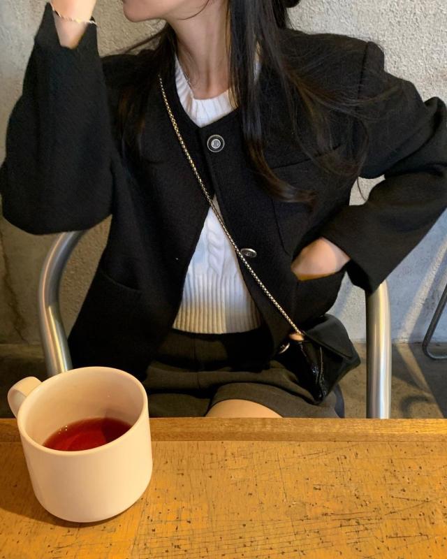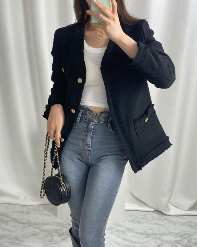 [하객룩/모델추천] 금장버튼 차르르 수술 포켓 브이넥 트위드자켓 2color