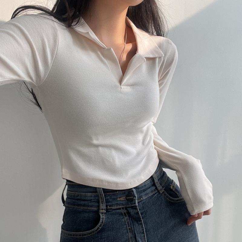 쫀득 탄탄 러블리 오픈카라 크롭 긴팔 티셔츠